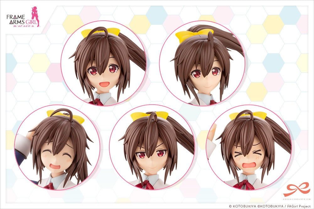 A standard, smiling, blushing, smug and cartoonish face come in both pre-painted versions and unpainted versions. (*Please note that the face parts included in this kit are not compatible with the separately sold models from the Frame Arms Girl series or the SOUSAI SHOJO TEIEN series. )