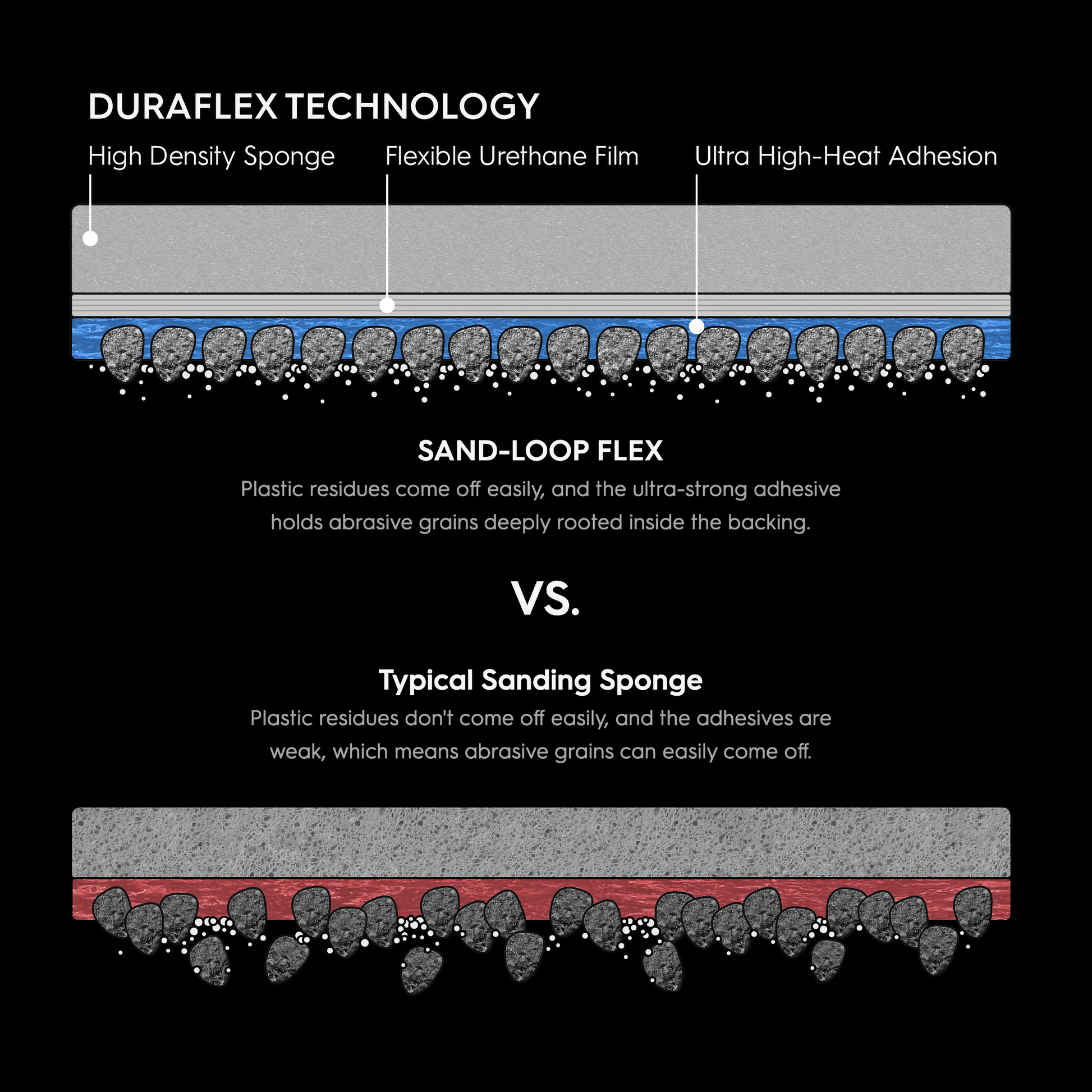 Using the Advanced Duraflex Technology, SAND-LOOP FLEX offers a semi-permanent use. The ultra strong adhesive in the backing holds the abrasive grains strong and tight therefore they don’t come off easily and offers a longer lifespan than any other typical modeling sanding sponges in the market.