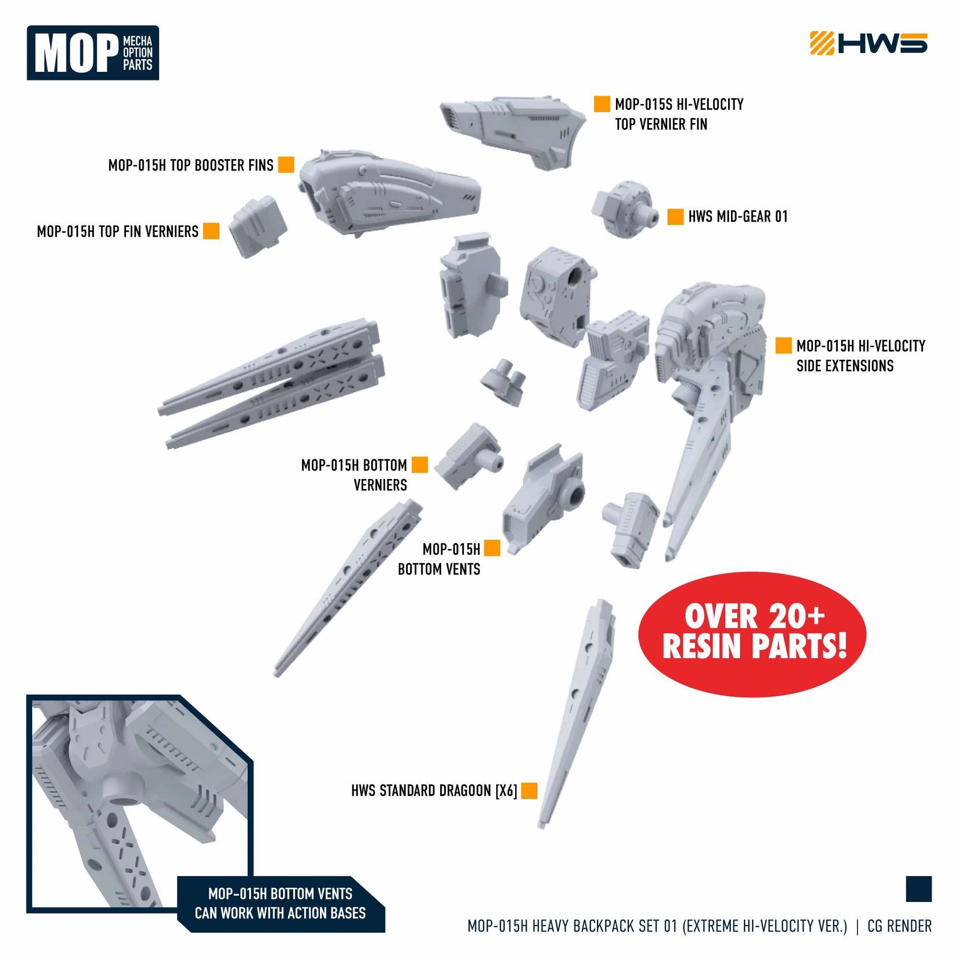 The MOP-015H includes various thrusters, heat sinks, verniers as well as dragoons (6 in total) and can be combined together in multiple ways.